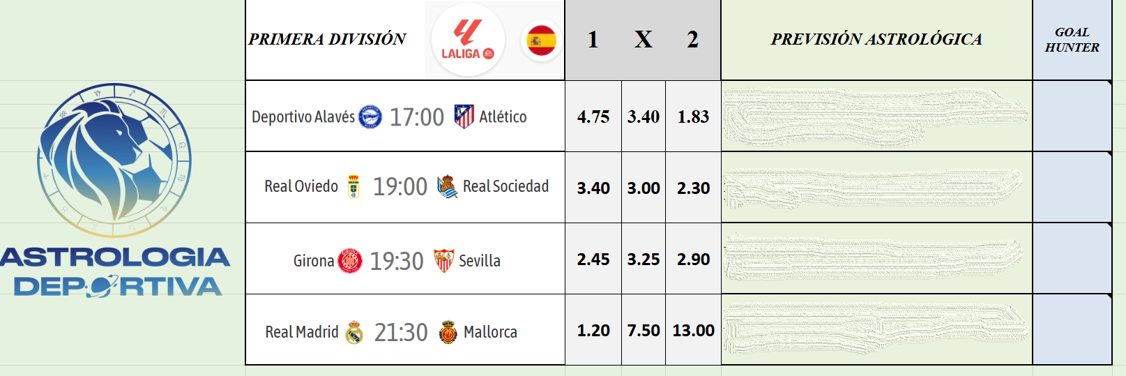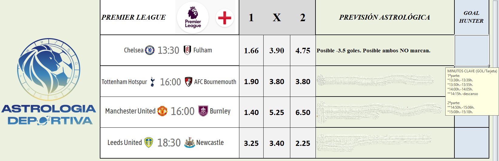 Cada día de la semana podrás obtener un análisis astrológico de los mejores eventos de fútbol. La base astrológica de datos sobre los diferentes jugadores, clubs, plantillas y árbitros se analizan junto con la Carta Horaria del partido, dando como resultado una previsión astrológica profesional y confiable que podrás consultar para tu uso personal.